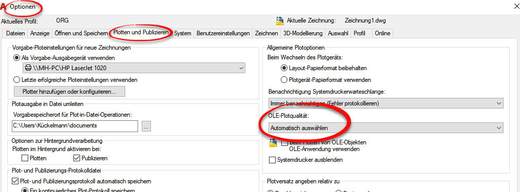 Lösungsansatz: Das OLE Objekt markieren und in den Eigenschaften die Plot Qualität anpassen (Bild 1). Werden OLE Objekte häufiger verwendet, ist es sinnvoll ggf. die Einstellungen in den Optionen zu verändern (Bild 2).